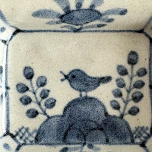 九谷の染付鳥文隅切角小皿です。